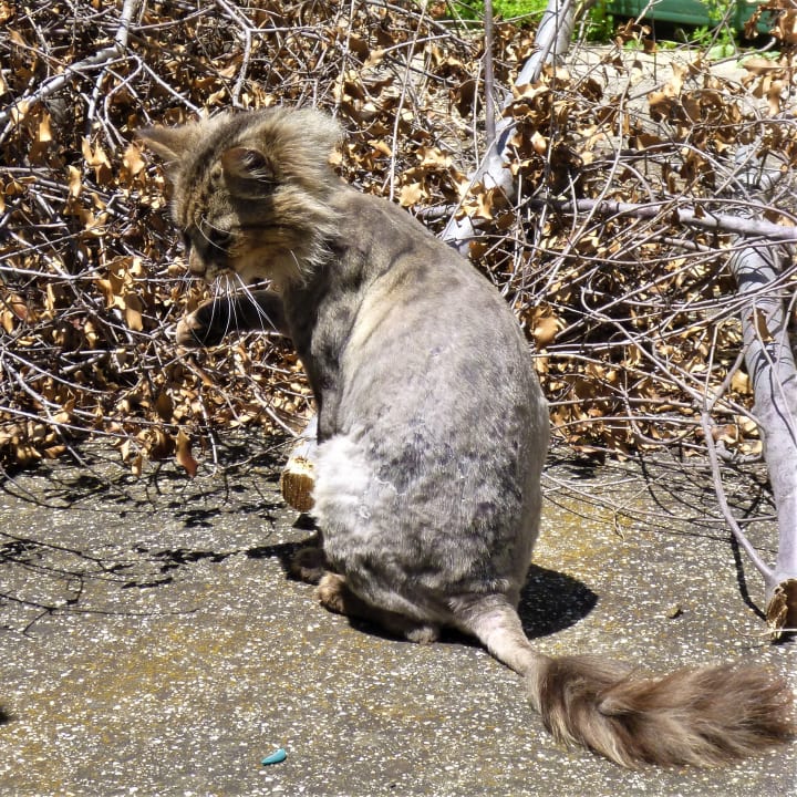 With the bonds of the cats holding strong, it became evident that Merri was starting to feel old age creeping up on her. In 2016; even though she was the youngest of the cats at seven years old (44 in human years); Merri started getting arthritis in her back left leg, which had her hobbling around on very cold days. She also had ulcers in her mouth and developed a skin condition that didn't seem to respond to treatment and the vet had to shave much of her fur off, leaving her looking a little odd.