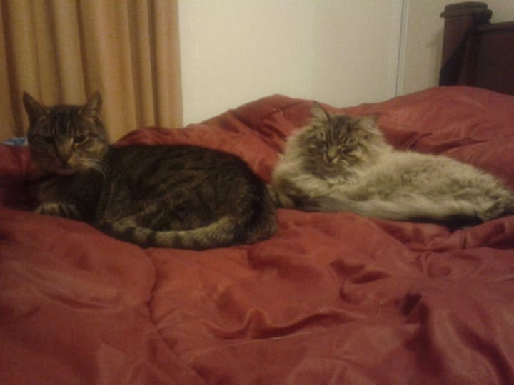 It would have been almost a month when Margaret and I came home from work and let the cats inside and noticed the change. Pippin, as usual, ate and went for his nap on the bed. Merri also ate her food, along with that of Pippin's, then went to the bed and cautiously sat next to the alpha cat. It was a big step for both cats. But when we came to bed, Merri was snuggled up next to Pippin, as he was grooming her, by licking her head. Both were purring away and that was it - they were friends.