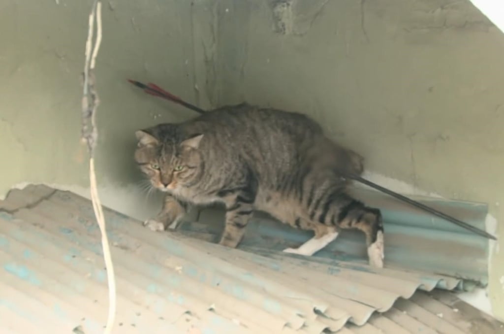 The cat was hiding under the sink, and as it slowly came out, we could see that it had an arrow stuck in its body, which was very long, about twice the size of the kitten's body.