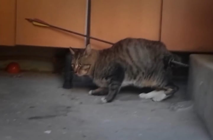 The arrow had completely penetrated the kitten's body, and the arrow swayed as the kitten moved.