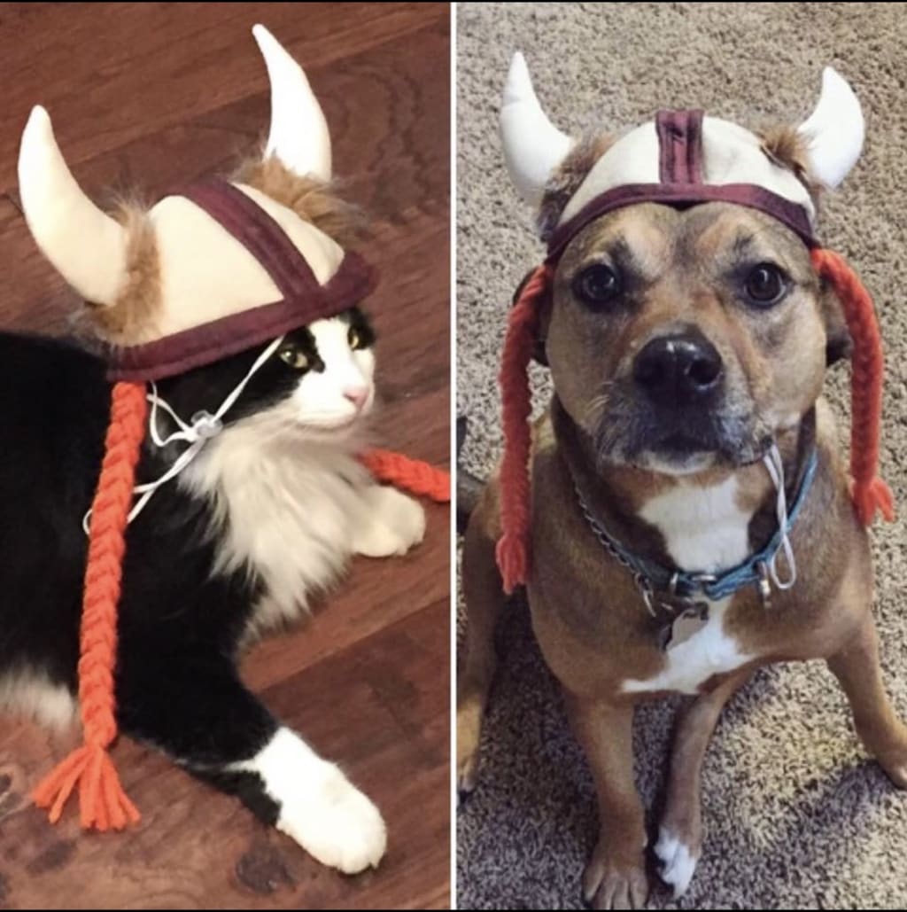 My sister bought the viking hats for these two a few years ago, and when I saw this writing challenge, I knew this photo was perfect. I came up with the idea for writing a ballad in the middle of teaching my senior British literature class who is currently studying Beowulf, the Norse epic poem. Inspired by both the photo and my lesson plans, “The Ballad of Chuck and Roxanne: A Viking Tail” was born.