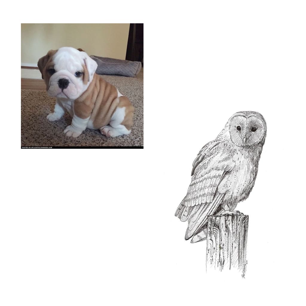 There once was a Bulldog puppy and a barn owl who lived together on a farm with other types of animals and a wooded area. The little puppy stayed with his mother and his siblings but the one animal who looked out for all the puppies while their mother was asleep and the puppies would tend to roam around.