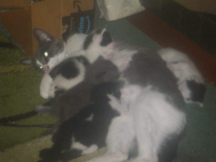 Time went by and Oreo became pregnant. She knew my apartment was the one quiet place where she could safely keep her kittens. It so happened that one day she gave birth to four kittens in my closet. There was one girl and three boys.