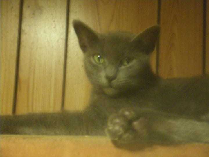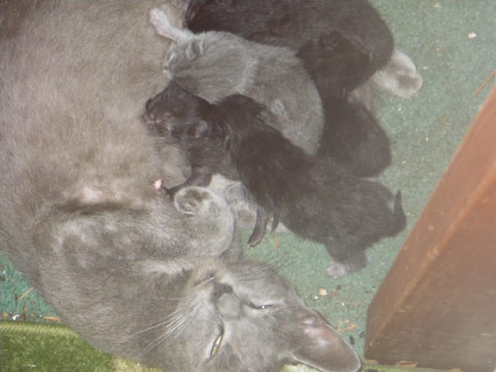 I wondered as I know cats are intelligent creatures if she remembered that she was born there. It must have been that way because in the early hours of the Fourth of July this year she gave birth in the same closet to five kittens. There are four black and one grey.