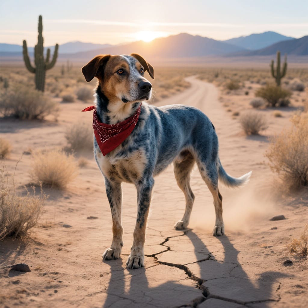 The Mojave Desert stretched endlessly beneath a scorching sun, its golden dunes shimmering like waves in the heat. Dust devils danced across the sand, and the silence was broken only by the whisper of the wind and the occasional cry of a distant hawk. In this harsh, unforgiving place, a lone dog walked—his coat matted, his tongue hanging dry from thirst, but his eyes sharp with purpose.