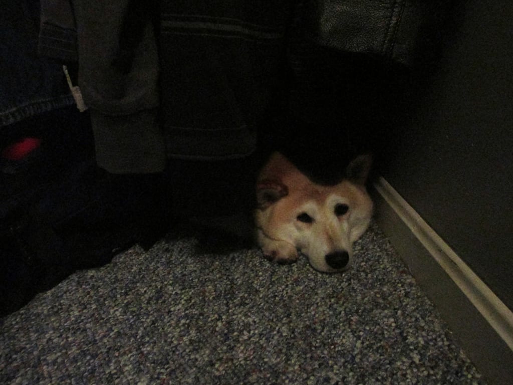 Later that night I woke up to my husband tapping my thigh. I listened for a second to hear something rooting around in the closet near my side of the bed. I flicked the light on and there was Miko, a pillow in his mouth. He had already pulled out a camping sleeping bag from the back of the closet and was now arranging a pillow for himself. He dropped it down and poked it with his nose until it was perfectly fluffed. He circled a few times in K9 fashion and laid down with his head propped up on the pillow. The tiny space was no longer a closet. He had claimed it just as he has claimed the cheeseburger. It was now his forever bedroom.