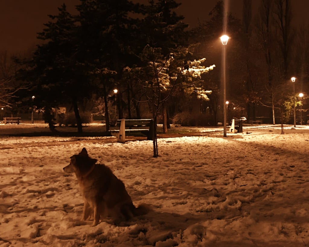 “Haha, don’t worry, look.” I took a couple of steps onto the snow to reassure her that everything is alright. The air was still, and the snow-covered park looked like a theater stage, almost fake in its peacefulness and perfection. I started walking backwards, calling her all the way.