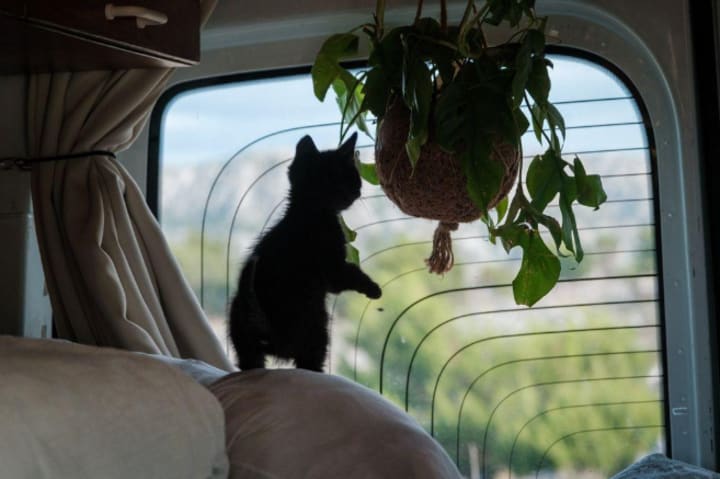 "He was happy to see new places and slept every time he rode in the van. The van is like a magical cave that takes him to a new place almost every day."