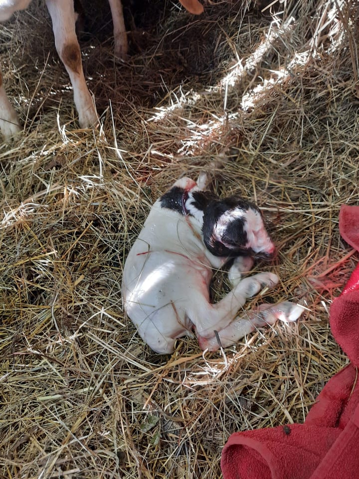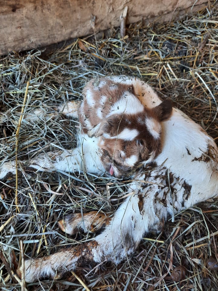 Finally, around ten, I went outside to start feeding. As soon as I got closer to the goats I knew that something was wrong. I saw two white spots in the yard and I just knew. Someone had delivered their babies, but it didn't go as planned. I hurried closer. One was dead, a beautiful girl. Looks like she didn't even have a chance. She must have been stillborn. This occasionally happens. The boy wasn't in much better shape. He was cold and just laying there.