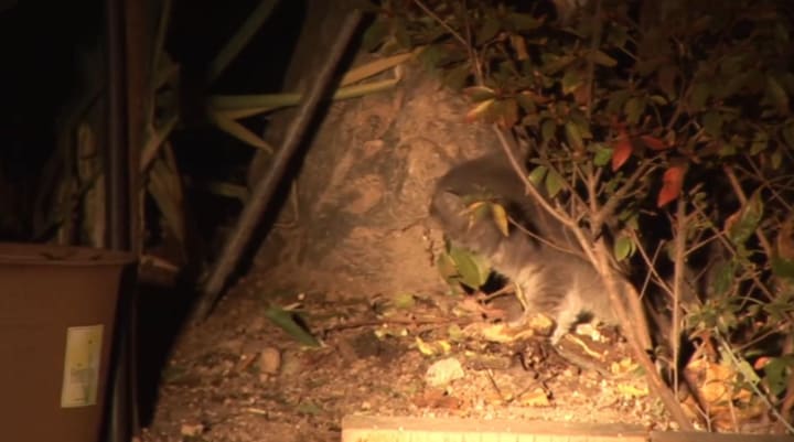 Night falls, the cat has not eaten for a long time, it is now a little hungry, and while there are few people now, it intends to go out for food. It sneaks into other people's homes and hides in the flowerbeds to eat.