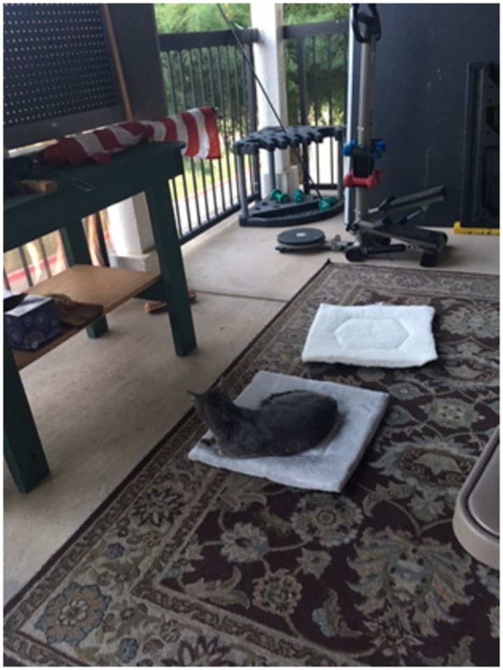 The other thing he liked to watch was all the car traffic. The balcony sits over the key road in and out of the complex. Traffic is usually light, but there are cars going by in both directions several times each hour. Emmett’s head would come up and watch them go by. He liked to sit or lay on the bottom shelf of the workbench you can see in the photo. Looking out through the railings gave him the perfect view of traffic down below.