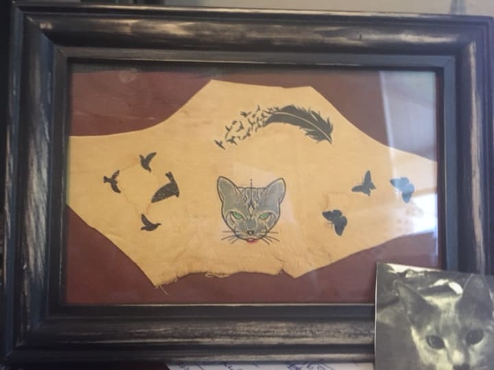 To preserve the legend, and as a tribute to Emmett the Master Cat, I made this small ink on leather design (couldn't find any car outlines I liked).