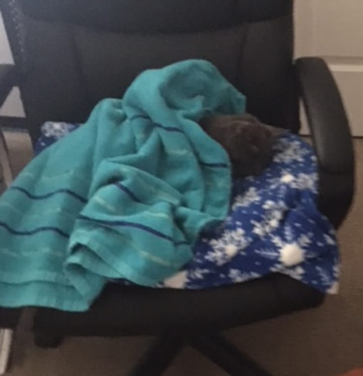 Finally Emmett got so weak, even though I was feeding him with a syringe and liquid cat food; he could barely hold his head up, couldn’t walk around and only slept. I could tell he was cold so I kept him wrapped in a towel or blanket in his favorite chair.