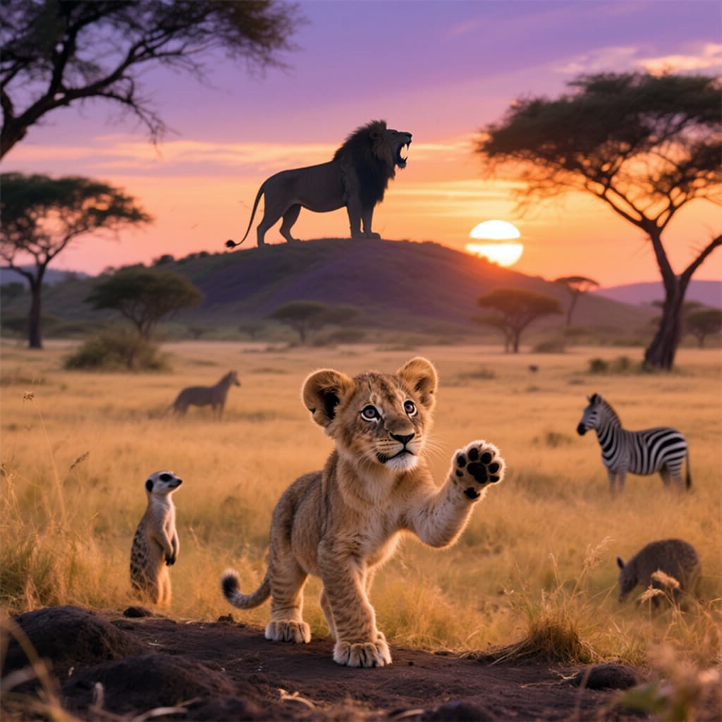 In the vast, sun-kissed savannah of Zubari, where golden grass danced in the wind and herds of wildebeests roamed free, there lived a lion cub named Leo. He was the son of Mufaro, the mighty king of the savannah, known far and wide for his thunderous roar that could be heard from miles away.