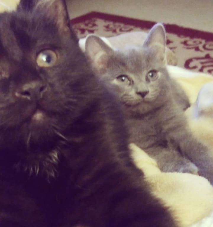 I immediately gravitated towards the little grey lady-killer you see above. He was a dead ringer for my Churchy-boy, but with a tail. Trouble was, he was already bonded to his wide-eyed brother, and my inner wanna-be witch was secretly freaking out with excitement over having a black cat of my very own. So the only logical thing was to bring them both home.
