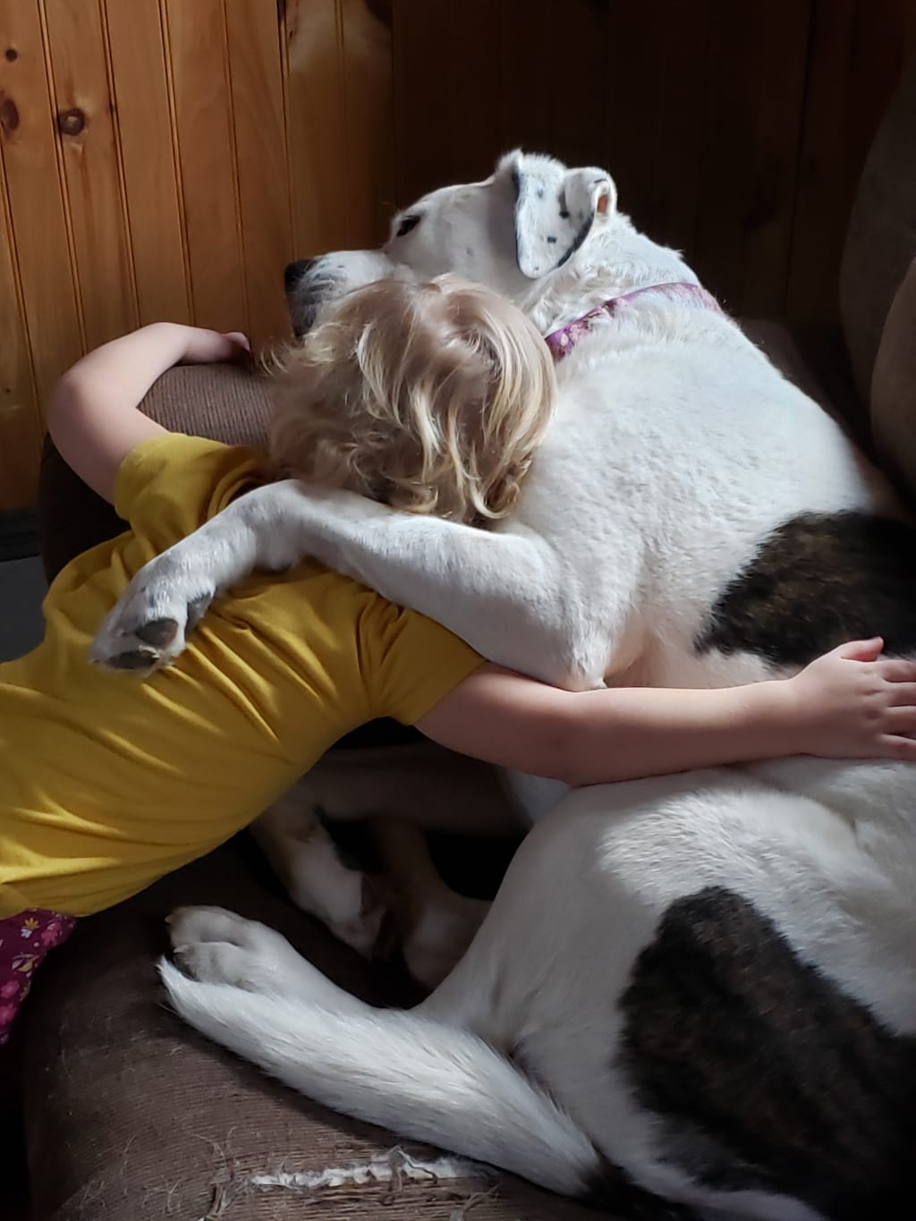 Bella still to this day gives hugs to those who need it most. She has got to be the favorite dog we have ever had. She loves kids and loves to play ball and run around. Her anxiety is a lot less than it used to be. And without her, I might be dead.