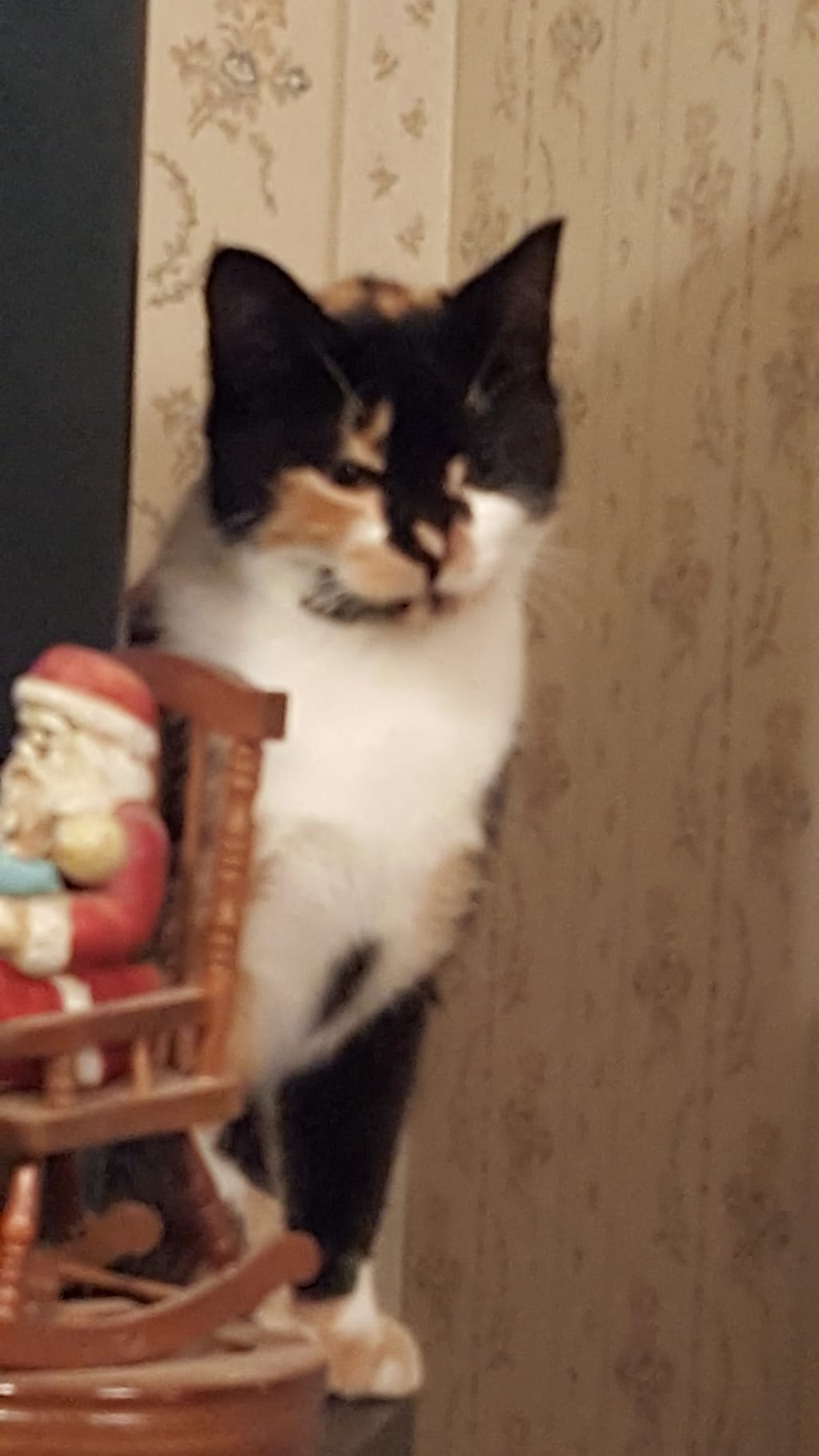 I saw movement out of the corner of my eye. I went to investigate and saw a calico cat running around. It started to run away when I went to investigate and it saw me. I called out to it and began a conversation. I called the cat her and sweetheart because she reminded me of a kitten I knew long ago. I asked, "Are you her? You're sweetheart aren't you? I remember you. I think I remember you. I called her sweetheart so I am going to call you sweetheart." It was a female kitten that had gotten caught in an engine when I was a kid.