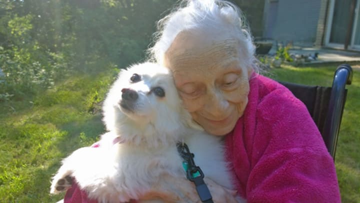 About 15 years ago, my sister Michelle brought my 84-year-old Mom to various places in search of a dog or a puppy for her. It was the last stop on the route home where my Mom met “Sugar,“ an American Eskimo who totally lived up to her name in sweetness. Apparently, lucky for my Mom and our family, Sugar’s previous owner had brought her back to this pet seller because she wasn’t a match for that person’s household. Michelle gave my Mom the most wonderful gift when she stopped into that pet store that day - Sugar was then about 6 months old when my Mom first locked eyes with her for what would prove to be a divine pairing of souls.