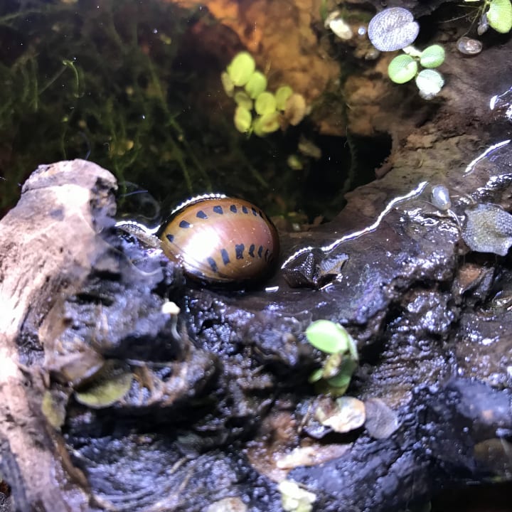 Snails: Snails are another wonderful invertebrate to keep in your tank, and they come in a lot of different colors and patterns as well. They are excellent at cleaning up algae and leftover food and will even clean up leaves from plants that are melting back. Just be careful since some snails are known to be prolific and can create infestations that are hard to get rid of (unless you have access to assassin snails, which eat other snails over time) and some species will eat your plants if they have them, so do your research. Nerite snails are popular for this very reason since their eggs won’t hatch in freshwater, and they have reddish-brown shells with very interesting patterns, some even have horned shells. They grow to be about .5-1.5 in or 1.3-3.8 cm, and are prone to escaping, so it’s helpful to have a lid. Sometimes tiny snails or snail eggs will hitchhike on aquatic plants, so you might find some bladder and pond snails spontaneously showing up in your tank. Some people consider these snails pests, but regardless it’s undeniable that all snails are excellent algae-eaters, and these ones stay small(.5-1.5 in/1.3-3.8 cm). Ramshorn snails are similar to bladder snails, but get bigger (1-2 in/2.5-5 cm)and come in pastel colors, they will reproduce in freshwater. Mystery snails get even bigger (2-2.5 in/5-6 cm) and come in a variety of colors. Unlike a lot of other large snails, these guys don’t eat your plants, and require both a male and female snail to reproduce in freshwater, and since their eggs are relatively large, it's not difficult to manage their population. There are many other snails that are great for beginners, but I’ll leave the list here for now. Make sure that your tank has enough algae for these herbivores, or they might starve. You can also supplement their diet with algae wafers if necessary.