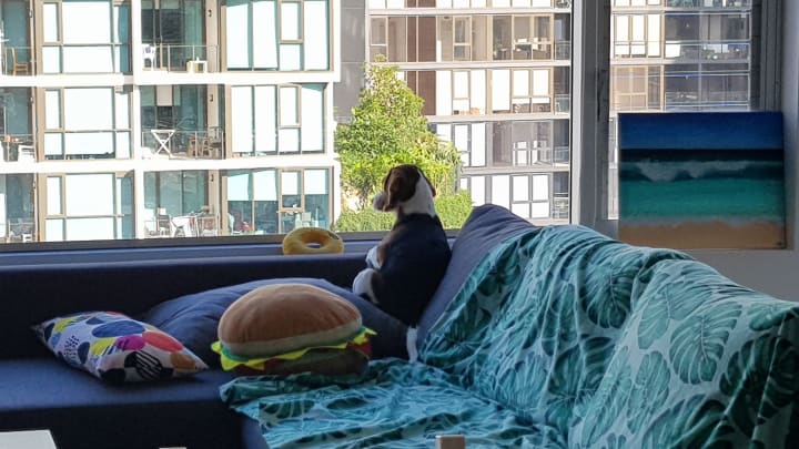 Her favourite place in the apartment is the side of the couch that rests on the window ledge. She’ll sit on the edge, or walk along the window sill (sometimes I think she was a cat in a past life) and looks down at the street just watching. She’ll sit there moving her head side to side watching the cars and people happily.