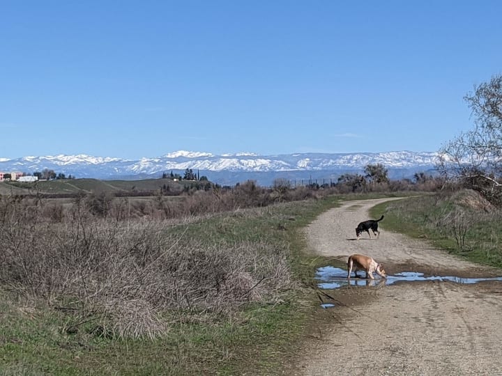 We continued on our walk. She drank from mud puddles. She at grass at the river. Tina ran hard.