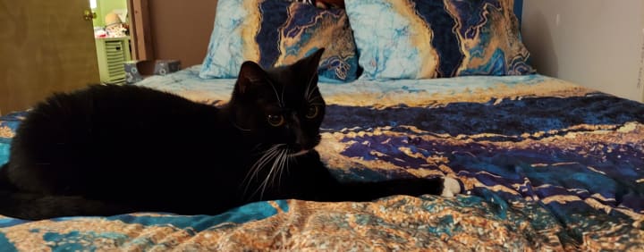 My last job of the day is honestly my favorite. I help Deanna settle down to sleep. Sometimes she lays on her back. I stretch out on her belly. My hindpaws rest on her thighs and my forepaws almost graze her neck. Usually, she settles down to sleep on her side. Then I can drape myself over her upper side, or curl up in the warm, cozy well the blanket makes by her belly. I spend the whole night on or beside her.