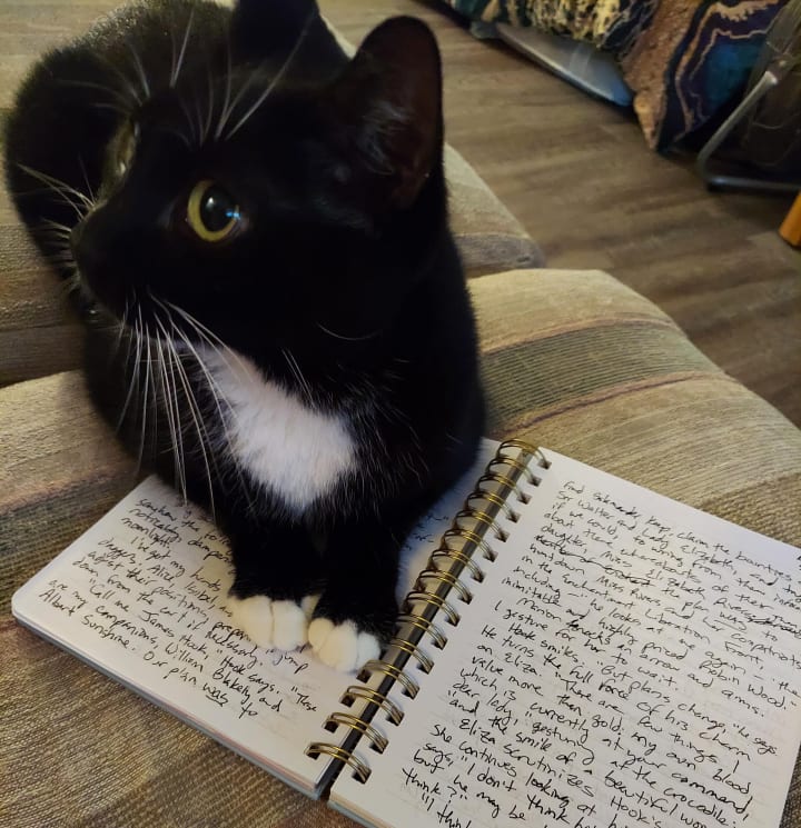 If she leaves her notebook open, I understand it as a polite request for my assistance. I do my part by sniffing it cautiously and stretching out on the page.