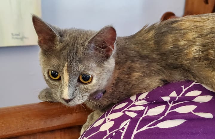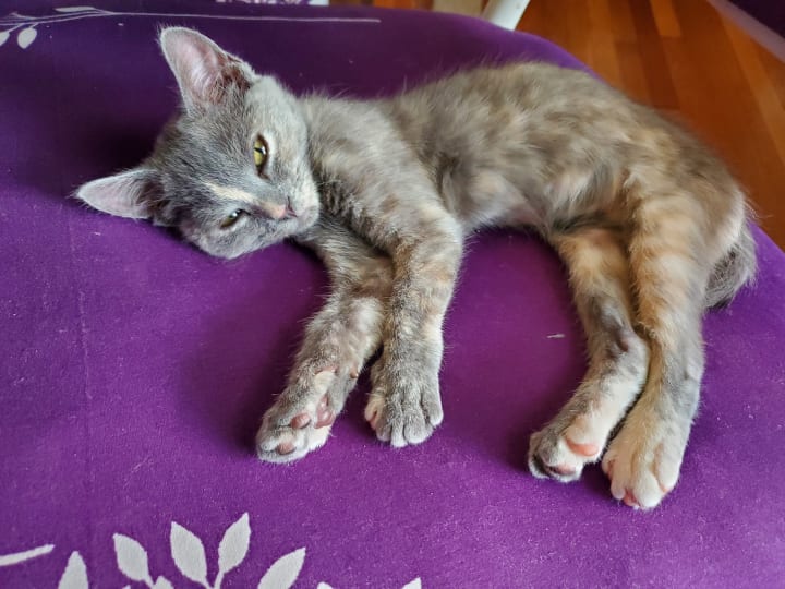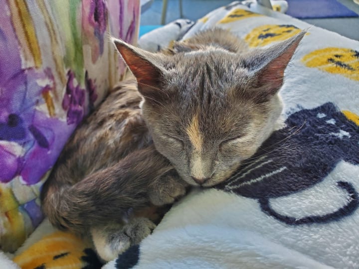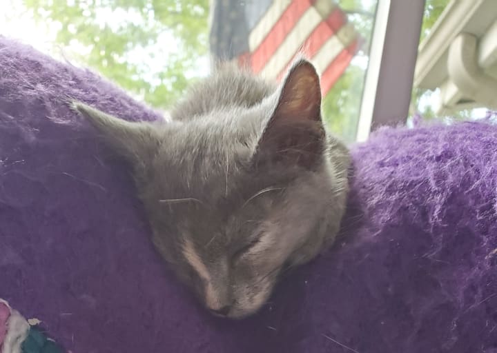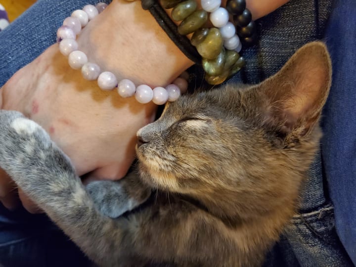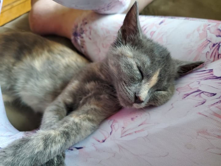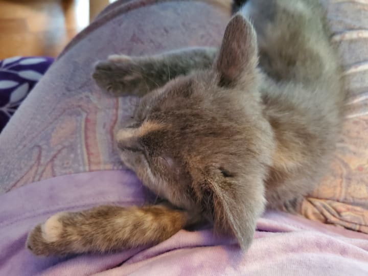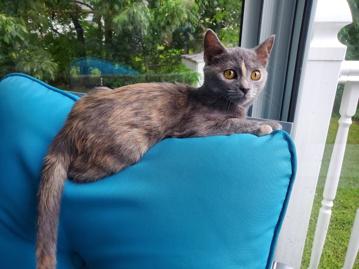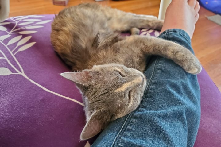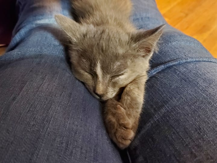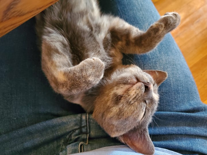 She’s also gained the nicknames of “Mufasa” and “Sour Patch” (or “Sour Patch Kid/Kid-ten”). This nutty kitten loves to jump onto people’s laps and the chairs next to people (when my cousin and his friend visited over the summer, they were smitten by her and dubbed her the lucky cat—whenever she curled up in their laps, she’d bless them with the best roll of the dice); she doesn’t always make the jump, though. One day when she was attempting to climb up to my lap, she misjudged the distance, digging her claws into the chair and clinging for what seemed to be dear life (she was only a couple of inches off the ground, though, since she had stretched herself completely out). The scene reminded me so strongly of the scene from The Lion King where Mufasa clings to the cliff face before Scar flings him off. Tsuki only lasted a few seconds before she fell. She often pulls a “Mufasa,” whether it be with a chair, the couch, her scratching perch, or some other high location. She’s quite resilient about it and always pulls away unscathed, so we find her antics rather humorous. She earned the nickname “Sour Patch” for her other antics. Like Sour Patch kids that are sour then sweet, Tsuki will start off sweet, cuddling your lap and/or licking your hand while purring, before she turns sour and starts chomping on you. It’s always a sudden switch, leaving you no time to prepare; she loves pulling this Dr. Jekyll and Mr. Hyde stunt. Honestly, it feels like she loves to keep us guessing. All too often she pulls these stunts while on my lap. I’ll often be writing short stories or working on art with her contently snoozing on my lap. Then she abruptly changes gears, trying to chomp on my arms/hands and playing with my necklaces. She keeps me on my toes and ensures that I can find joy in the little things, acting as my cuddle buddy, writing/art companion, and playful cohort.