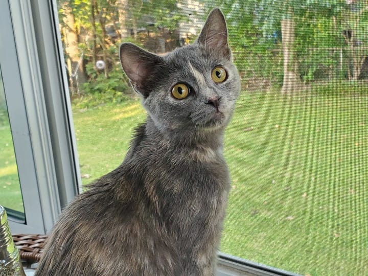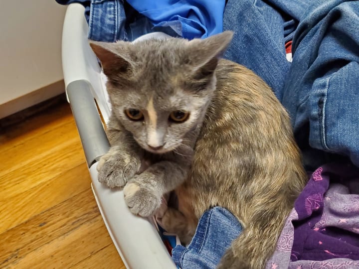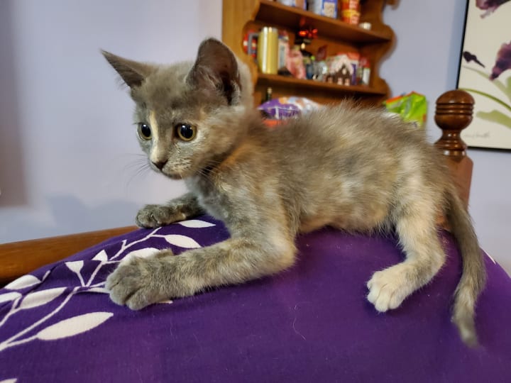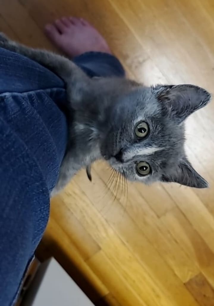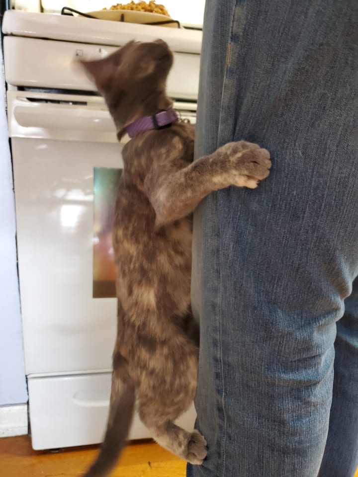 Tsuki is such a goof. She’s always full of antics, pulling off the most surprising feats. When we adopted Tsuki, her foster mom insisted that she wasn’t a jumper or a climber. We quickly learned otherwise. We adopted her over the weekend, and after spending the weekend with her we had to go back to work, as life waits for no one. Once I got home from babysitting, she came running up to me and launched herself at my leg, clinging to me as if I would disappear again. It was rather surprising but incredibly adorable and heartwarming. She also loves to jump up onto people’s legs/backs and climb up to see what they’re doing; she’s done it to me so many times I’ve lost count. Her favorite times to do so are when people are making food or when I’m brushing my teeth. She’ll climb up and perch herself onto my shoulder, trying to snatch the toothbrush from me. She’s also done so after I get home from work and then decides to sling herself over my shoulder as if she’s a sack of potatoes. She’s content to stay there for several minutes, so I suppose it’s comfortable. Tsuki is such a character.
