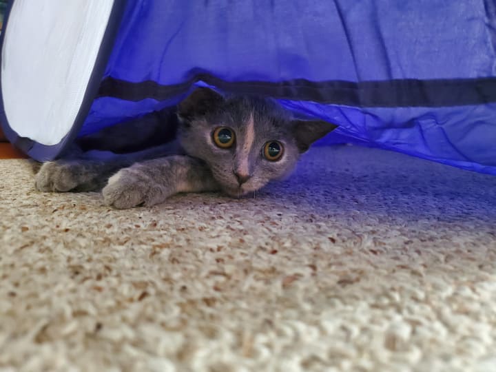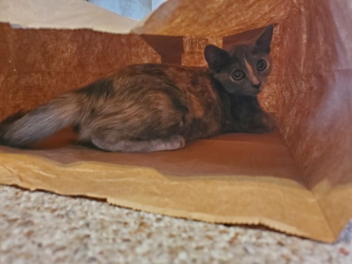 She can be a rather hyper kitten; she's the complete opposite from our previous cat. Where the former kitty companion was chill and thought climbing/jumping was often too much effort, Tsuki is the kitten version of the Energizer Bunny. She keeps going and going and going until she can’t go any longer and passes out into a deep slumber. My sister decided to get her a playpen to act as a “time out space” for when Tsuki gets too nutty. Funnily enough, Tsuki adores that playpen and willingly goes inside it all the time. To add to the irony, she even put herself in “time out” once because her hyperactive jumping and running ended up flipping the play tent on its side; she hadn’t figured out how to jump out of it, so she effectively trapped herself until we flipped the tent right-side up again. She immediately began to race around again. She’ll play with anything and everything, but her favorite “toys” tend to be caps, pencils/pens, and bags. Tsuki often snatches writing utensils (or dining utensils for that matter), caps, and bags from us to claim as our own. She knows what she wants and isn’t afraid to acquire it.