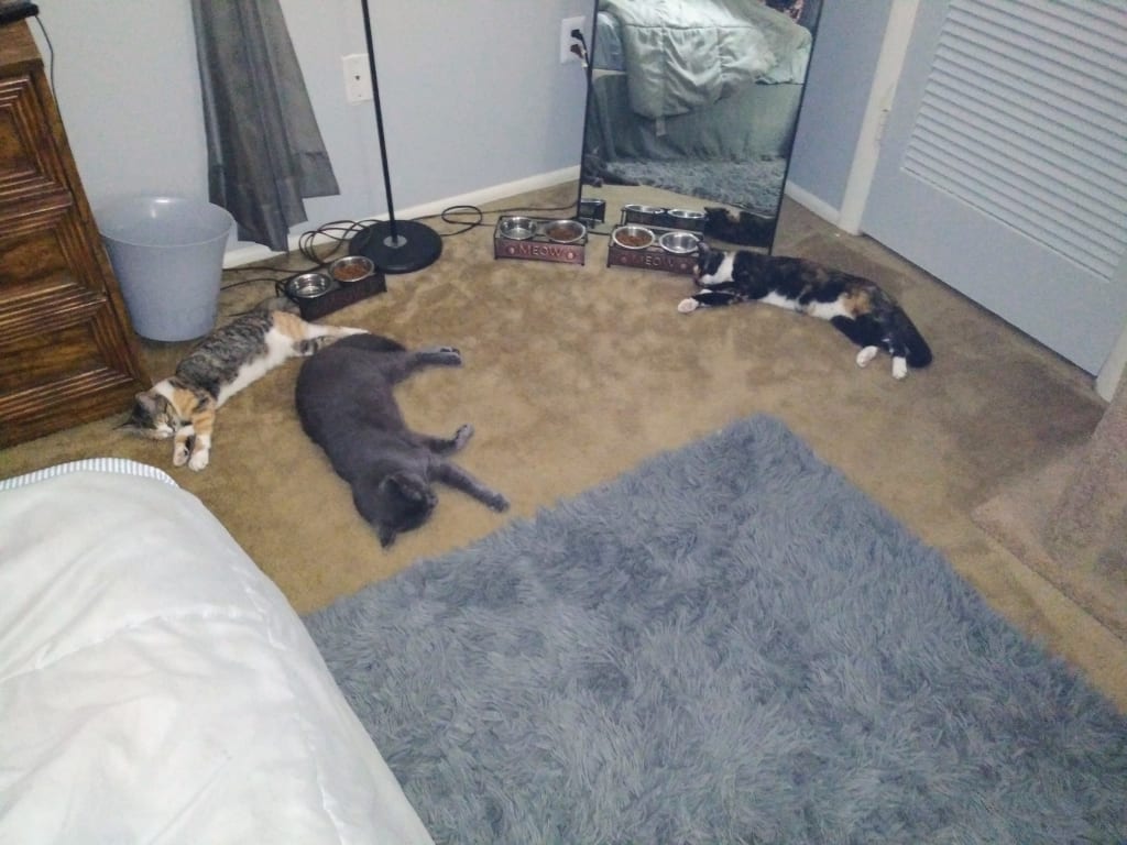We drive two hours to to where they were located and once we saw them I knew I couldn't take one. At the time my job demanded 10 hours a day and sometimes I'd work longer, as well as going in on off days here and there. In my mind I had to get two so that they wouldn't be lonely. I wanted two boy cats but friends had told me boys are very territorial and leave odors. So.....the two girls it is. I named them Royalty (grey) Majesty (multicolor).