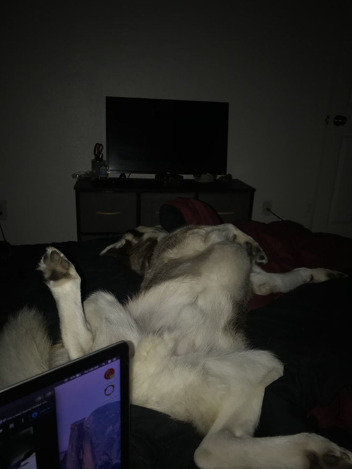 Here is a picture of my Siberian Husky, Natsu. He lays in my bed sprawled out like this almost every night, exhausted. He doesn’t have a job, and doesn’t help clean up around the house but perhaps he’s exhausted from living in a world that never acknowledges his futile attempts to show love. I see him though. And I understand and love you Natsu!