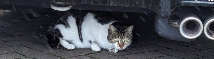 This one ran and hid under a car, but was very visible to me. He was in the open, but when I tried to get a picture he shot under a car, where he obviously felt I couldn't get to him, and felt much safer. I was not trusted by this one.