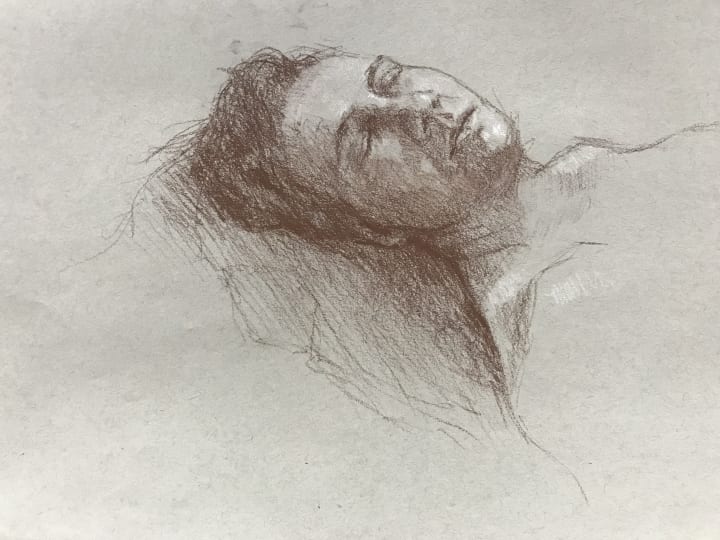 This was a drawing of me from the last art class I modeled for, at one of my favorite art schools to model at. This drawing was from the last pose of the night; I decided to lay down for this one because it was going to be the longest pose of the night. I was getting tired and wanted to close my eyes and relax for a bit.