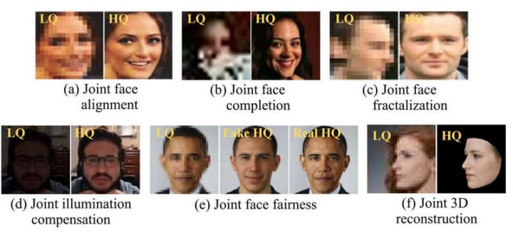 There are some essential components of face restoration, including joint face completion (fix occluded and low-quality faces), joint face fractalization (primarily designed for frontal faces), joint face alignment ( the use of aligned face training samples for optimal performance), joint face recognition (the restored face image aligns with the ground truth in terms of identity), joint face illumination compensation (improve the restoration performance of current algorithms on low light low-quality faces), joint 3D face reconstruction, and joint face fairness (employ suitable algorithms to mitigate racial bias).