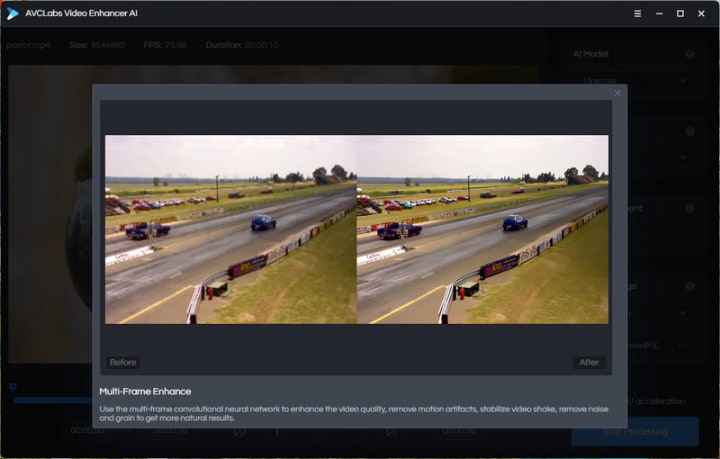 In the upper-right panel of the application, you can choose "Upscale" or "Multi-frame Enhance" as the AI Model.