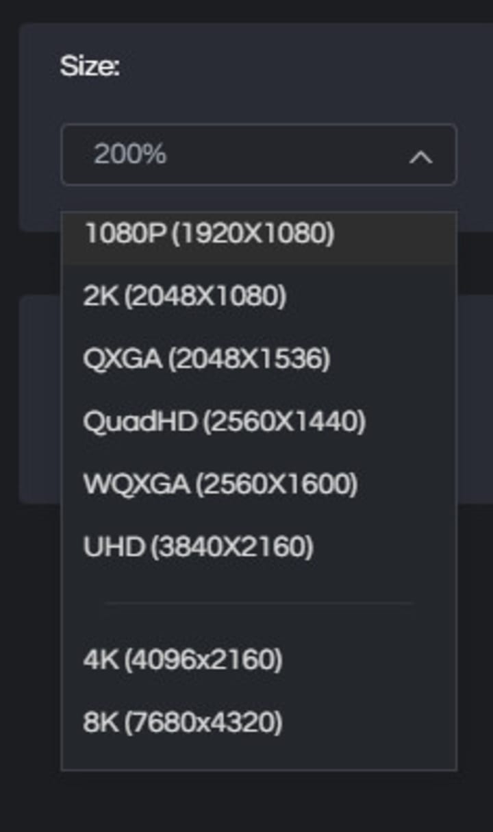 Unfold the output preset and adjust the output to 720p, 1080p, 2K, QXGA, Quad HD, WQXGA, UHD, 4K, or 8K.