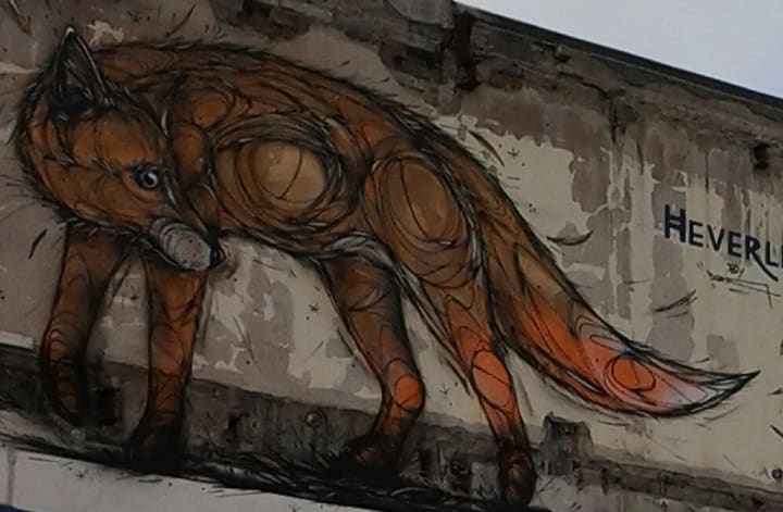 I know it advertises a premium beer, but as for the meaning being chasing the hair of the dog, this is lost in me because the other animal on the mural and piece of Belfast street art is a fox, so this cannot be the meaning of this piece of street art unless the artist is young and hasn't heard the saying, "Chasing the hair of the dog," and has substituted the dog for a fox in their understanding of the saying, or maybe they have brought their own slant on the saying with, "Chasing the hair of the fox," either way it is still a brilliant mural and piece of Belfast street art, which is why these two pieces of street art are included in my story.