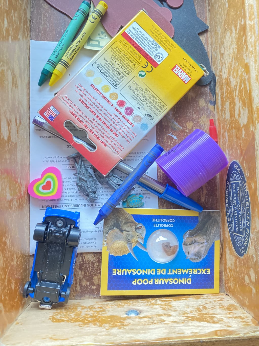 And I remember emptying out all the crayons and the papers and pine cones and feathers