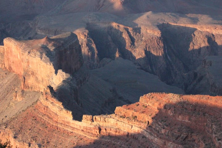 Warm light pours over the deep rivets of the canyon. Falling like gold onto the beautiful rock formations. Sunset is something else in the canyon, you watch as the blazing sphere disappears under the dark horizon. The brisk night's cold creeps in slowly. Replacing the view with darkness, utter darkness interrupted occasionally by the light of the headlamps donned by late night hikers. Light bird chirps, quiet cricket sounds, and the rustle of leaves in the wind. The light that kept the dark away recedes as the ever peaceful night settles on the canyon.