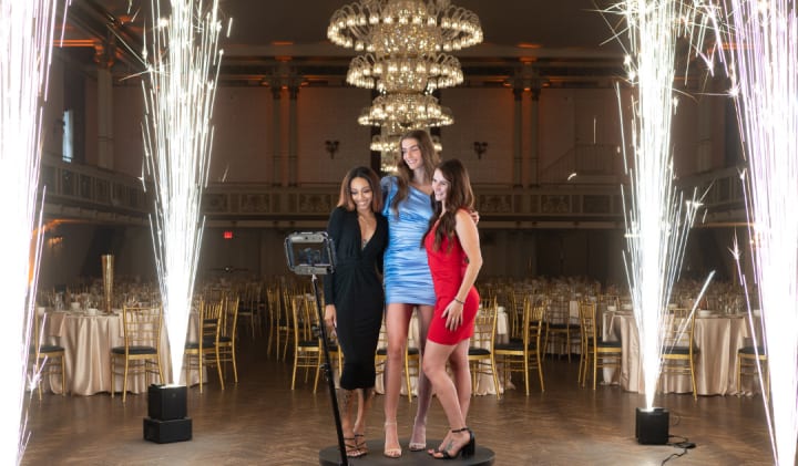 Châteaux Noire provides professional, hassle-free, and premium service while using the latest technology to capture high-quality content that your guest will love. Our 360 booth package includes: on-duty attendants, professional delivery, setup & takedown, LED Lights, themed props, unlimited videos, custom borders, unlimited sharing via text, email and social media and you can also enjoy amazing add-ons like cold sparks to your photo booth experience.