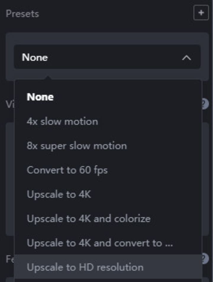 Method 1: Go to Presets section and select Upscale to 4K. There are 8 preset pre-configured options that you can use right away.