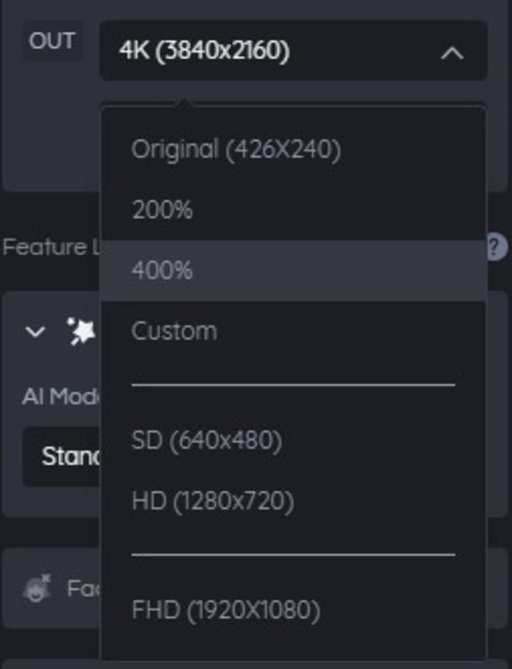 Method 2: Enable the AI Enhancement feature and set the output frame rate and output size with a range from 200% upscaled, SD to 4K and 8K in the Video-Out section.