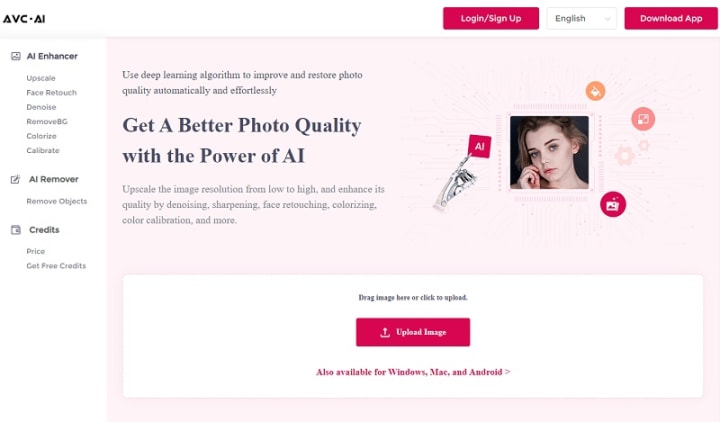 Visit AVC.AI. and log into your account. Otherwise, click on the Sign-up button to create one (You will get 13 free credits for the first registration). Then click on the Upload Image button or drag and drop the source image directly into the site.