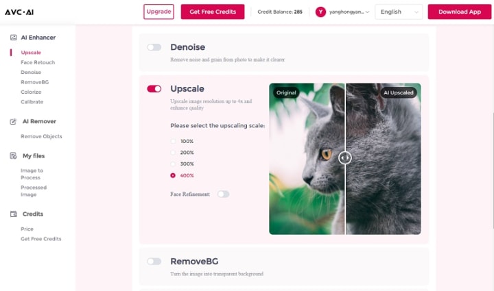 AVC.AI is an online AI-based 4K image upscaler that can upscale and enlarge your image four times without losing the original image quality and even repairing the original one. The other features of it include removing unwanted objects and watermark from photos, enhancing video quality, colorizing B&W images, etc.