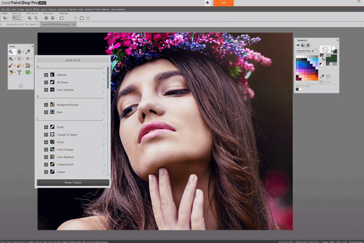 Corel PaintShop Pro is advanced image editing software that has a well-thought-out interface divided into three main parts. The tools can be found under the Manage, Adjust and Workspace tabs.