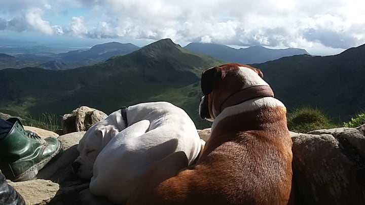 Our boxer's Dizzy (pictured right) and her 1 year old puppy Ziggy (Left) on a 5 hour hike up Mount Snowdon, in Wales. They say a picture says a thousand words, and this photograph captures perfectly Ziggy snoozing in the sun, relived to have reached the summit, and Dizzy's awe as she watches the clouds go by. Taken on a 24 megapixel smartphone, we had chosen the perfect setting for our photography trip to get some beautiful landscape images. However, this picture, like most animal photography, relies on an element of luck. The scene was too perfect, and I snapped the shot before they became impatient and excited to begin our descent.