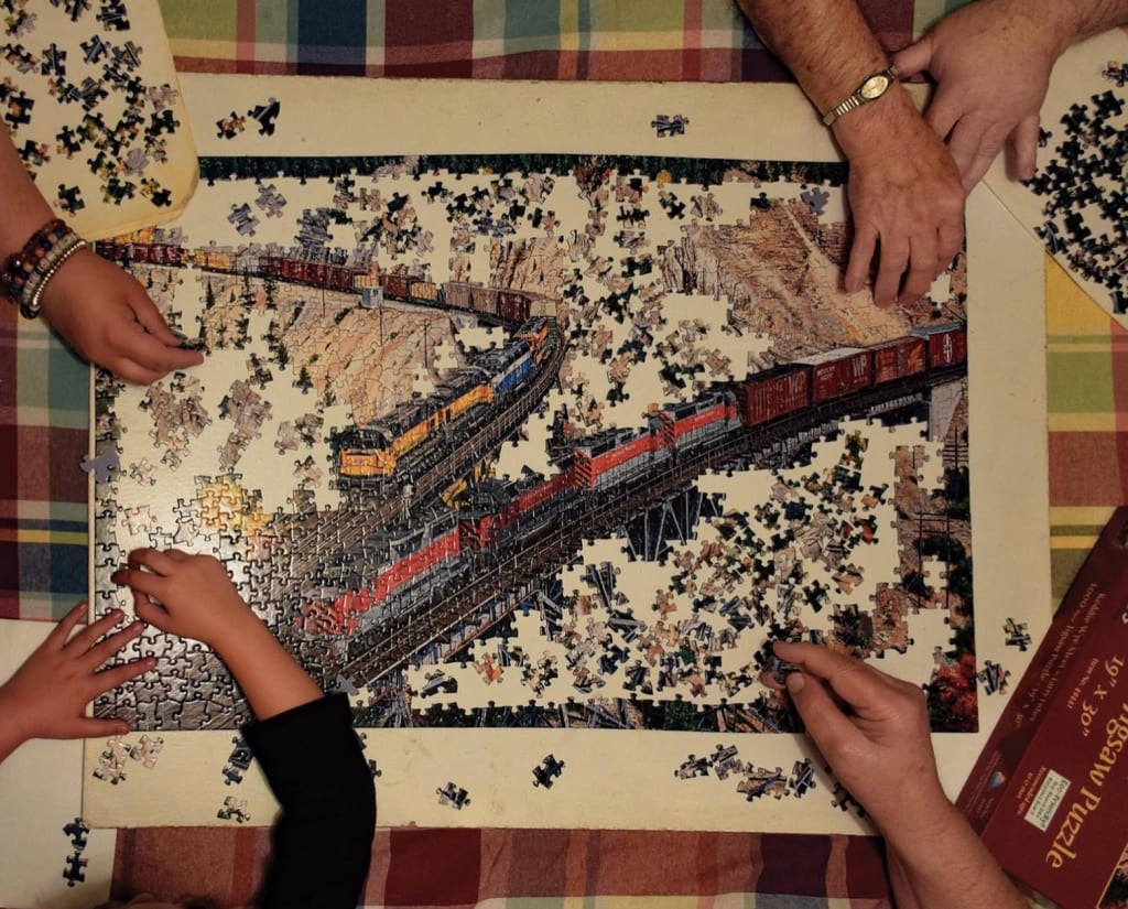 Four hands gathered around a table, working on a puzzle. My Nana’s hands are in the top right, my Pappy’s in the bottom right, my sister’s in the top left, and my six-year-old niece’s tiny hands in the bottom left.