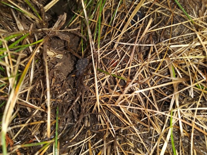 And by getting a hint of what's going on, I'm pretty sure it's a spider... but there's something weird about it, and no, it's not those slightly glowing eyes. So I moved some grass around, waited for the critter to find a better position, pose for the camera and... voila!