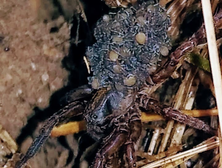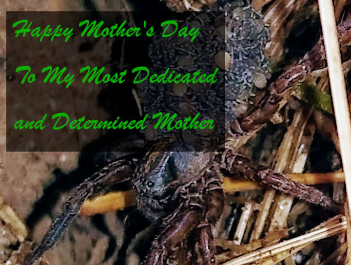 Now that belongs on a mother's day card. Look at the strength, determination, look at that expression of, "If you touch my babies I will bite you!" In my opinion, that's the true picture of love and determination. It's true dedication to her babies and their well-being. Maybe we think it's a little creepy, but is that really fair? She's creating life for a whole new generation of creepy crawlies that will control our bug population and carry babies on their own backs.